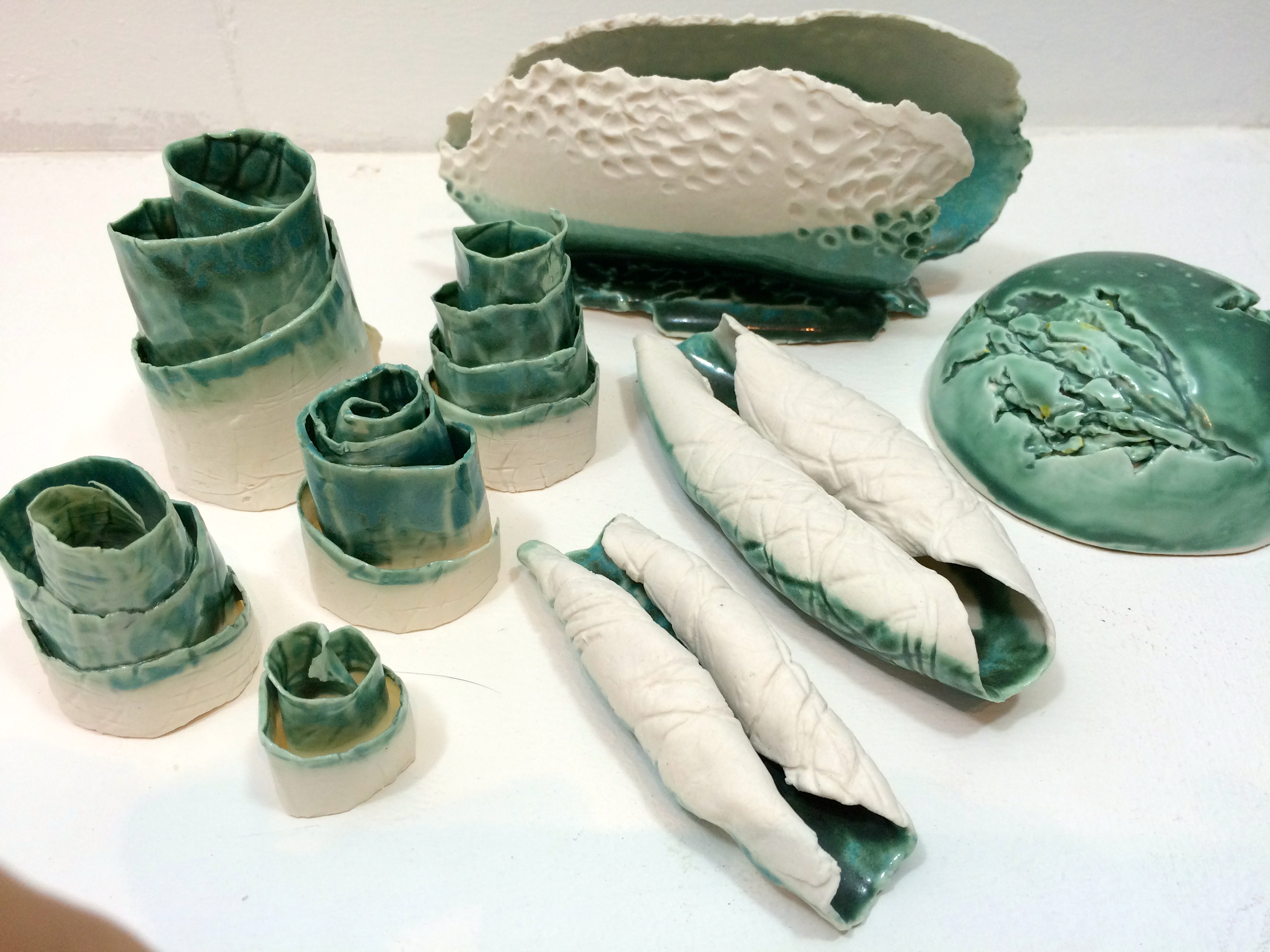 Another collection of partially glazed forms I called The Nereides after the fifty Haliad nymphs or goddesses of the sea, that represented various aspects of the sea such as the waves and currents, foam, creatures and the shore. I especially like the curled and spiral forms. Some are embossed with net, shells or seaweeds. Some suggest a hiding place for sea creatures, or a shell.