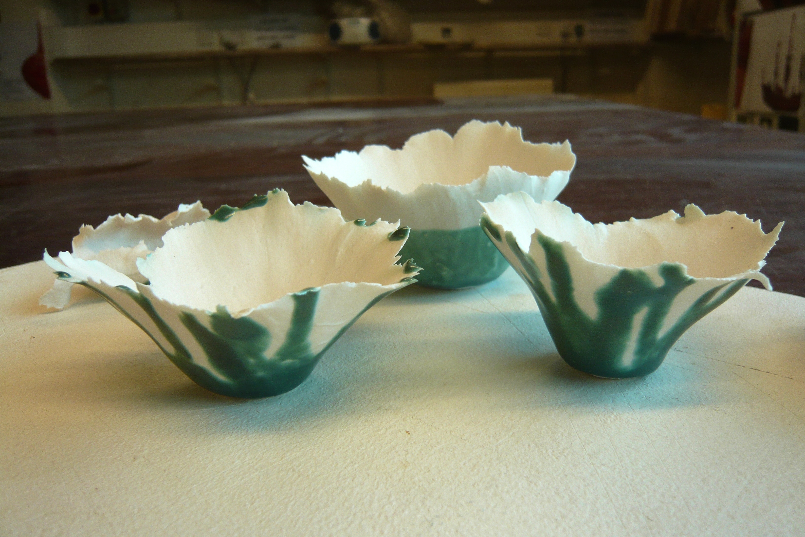 With these three porcelain bowls I dipped or dribbled copper chun glaze on the outside only.