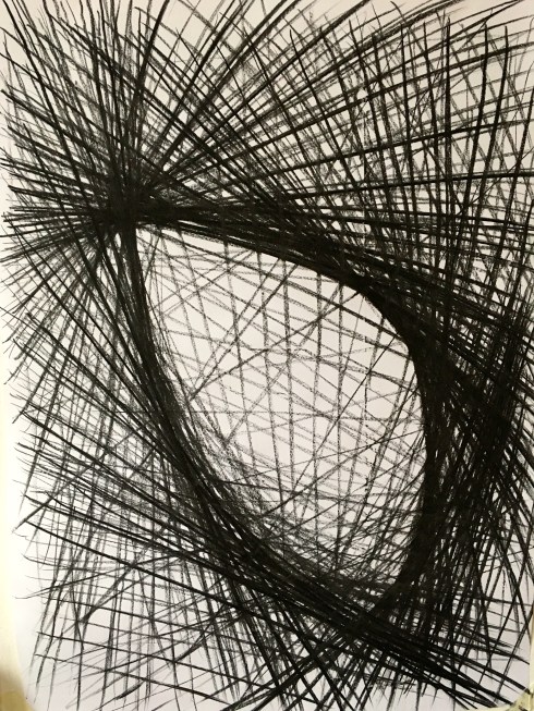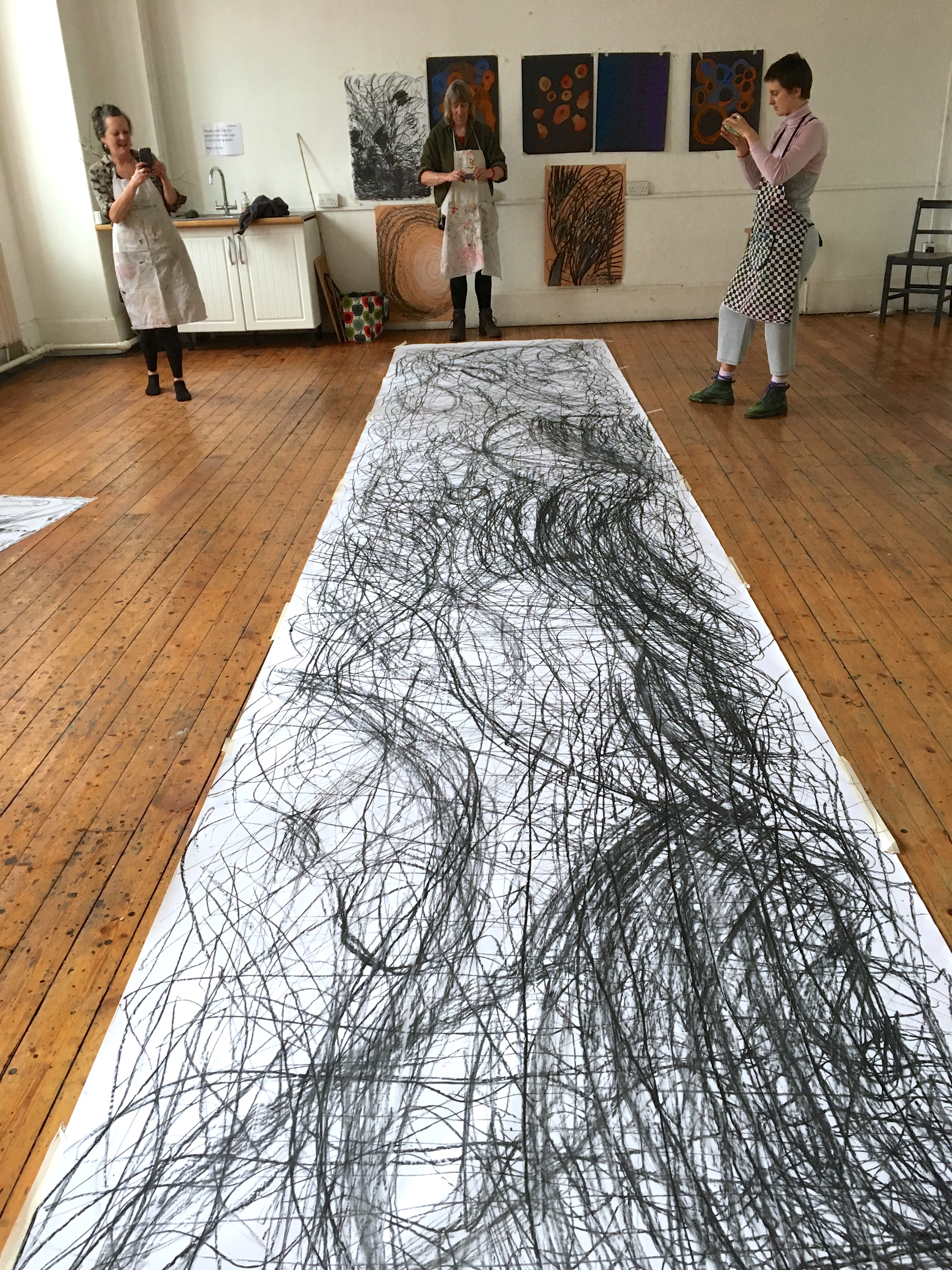 In a workshop with Nicci Wonnacott we have been drawing without pre-conceptions, sometimes using both hands at once, or long sticks, pampas grass, sponges, ink, chalks, paint, thinking of music, and ‘drawing with the breath’. It is a meditative and rewarding experience, particularly the collaborative work where you feed from and into other people’s ideas and perceptions.