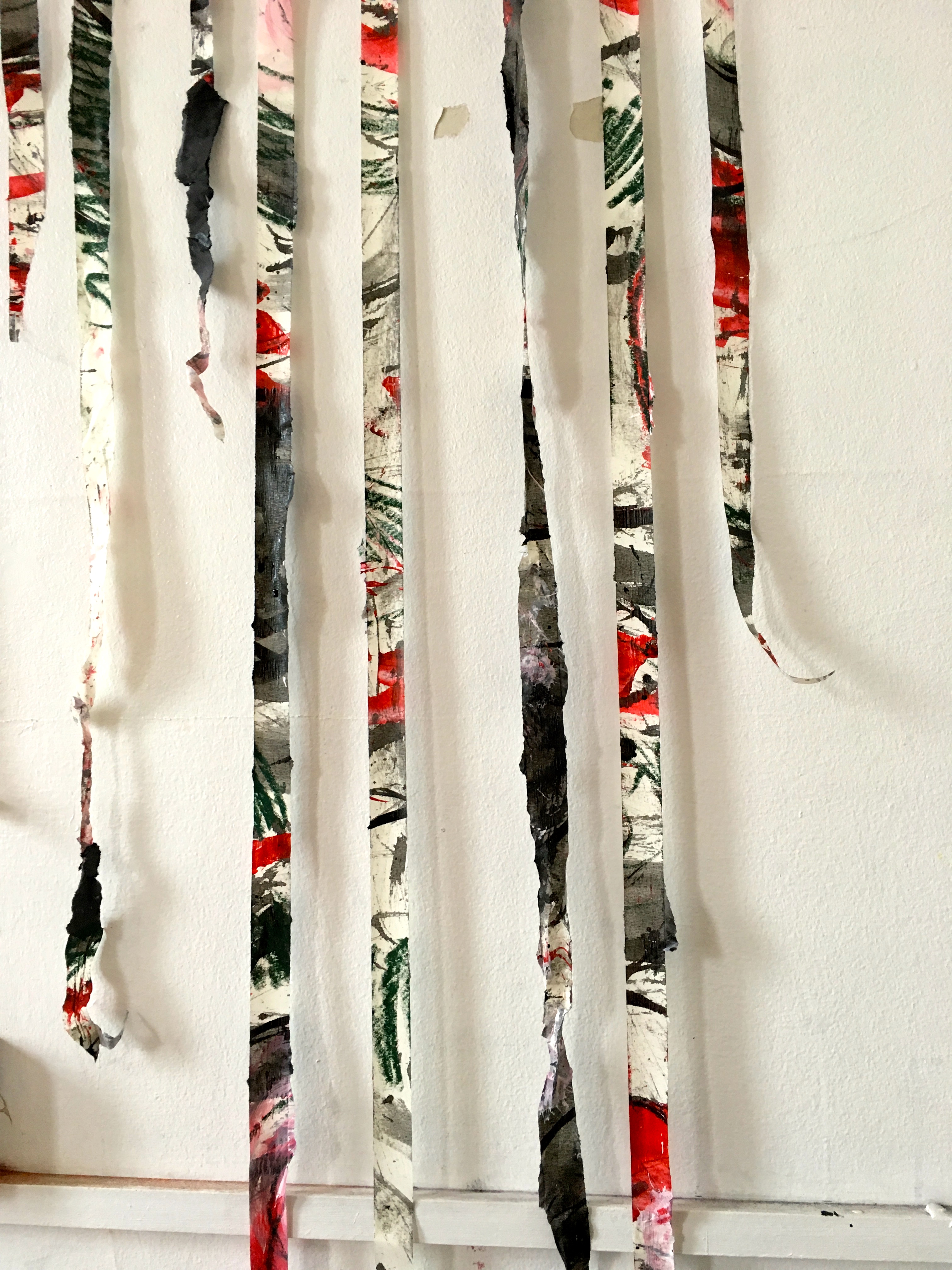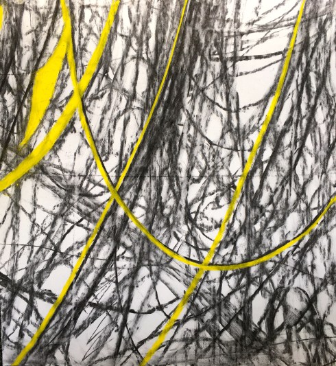The wad on a long stick created large areas of dark tone which I found difficult to deal with, so early on I stretched masking tape across the paper to break up the chaotic soup that would almost inevitably result.