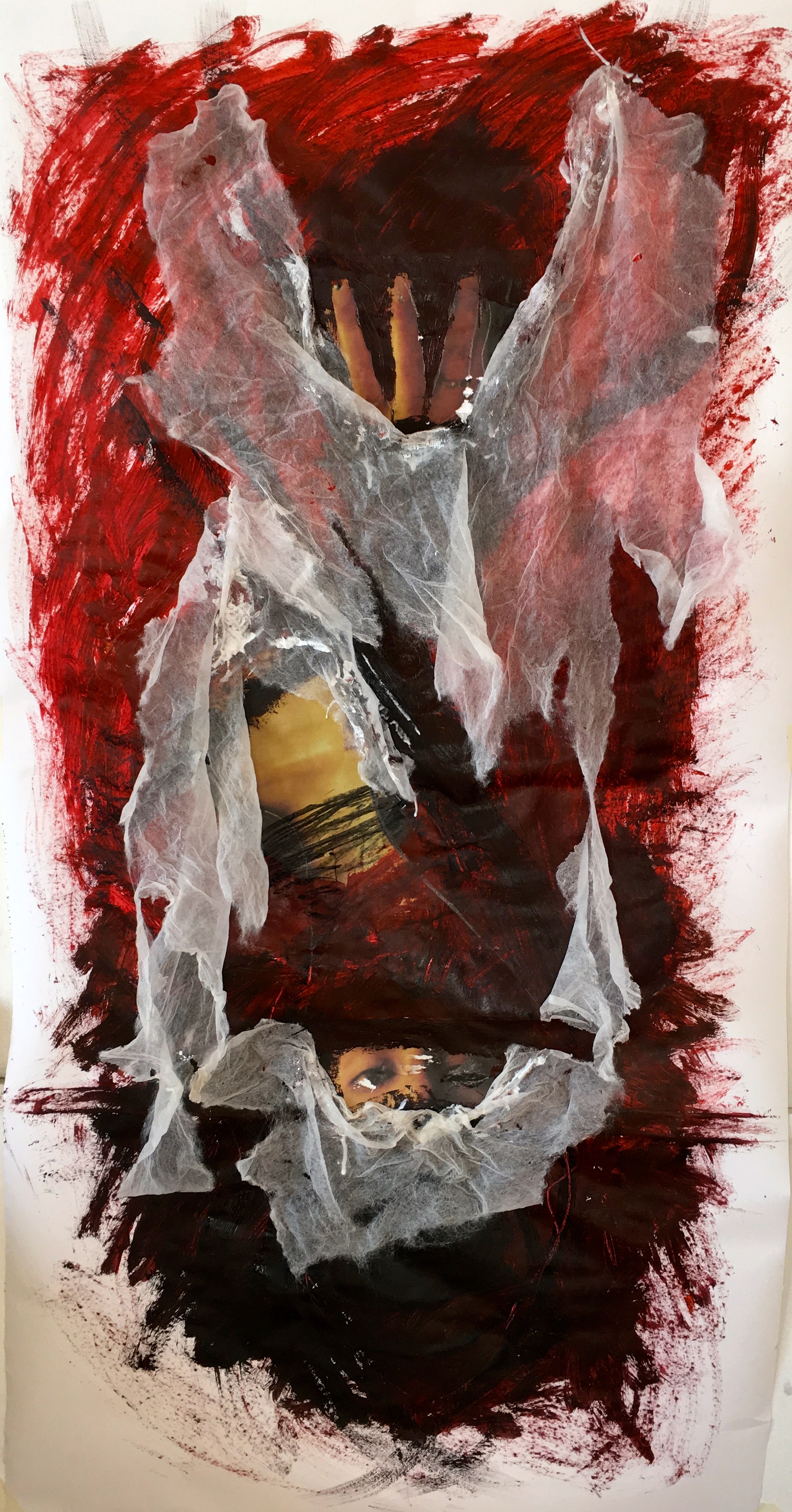 I found a fashion shoot where a woman of probable Middle eastern origin was posing in very strong, confrontational poses. It struck me that she might be hiding a background of subjugation or abuse, and led me to consider this in my work (see above). I used 3 images, painted over and scratched into, with fabric added.