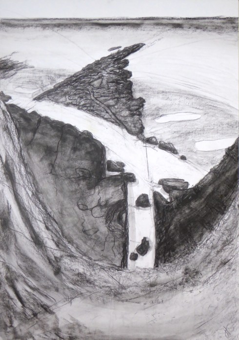 I am fortunate to have one of my charcoal drawings, an abstracted landscape, ‘Above Orcombe Point’ showing at the RWA 165 Open Exhibition in Bristol from 1 Oct to 3 Dec 2017. It is hanging in the beautiful Stancomb-Wills Gallery with a high vaulted ceiling and beautiful light, surrounded by other predominantly black and white works, including sculptural pieces and ceramics. My work is alongside that of Laurie Steen, whose exquisite, delicate studies of trees I greatly admire, and whom I did a drawing course with a few years ago. The exhibition is varied and inspiring – well worth a visit.