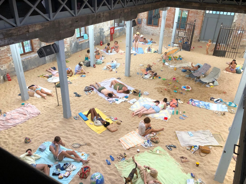 The Golden Lion prize winner this year is the Lithuanian entry ‘Sun and Sea‘, an opera-performance performed on a constructed beach in a warehouse viewed from above. In the course of an hour the audience is entranced by simple melodies with hard-hitting content emanating from the characters scattered across the beach: sun-bathing, eating, playing ball and trying to control their dogs. They sing beautifully and powerfully of climate change, sun screen, pollution of the seas, the futility of working at a desk and travelling the world. The songs are personal, heart-felt and not meant for others to hear… There is an extraordinary intimacy with the small audience who feel voyeuristic as a result of the viewpoint, and the fact that the singers are ignored by those surrounding them.