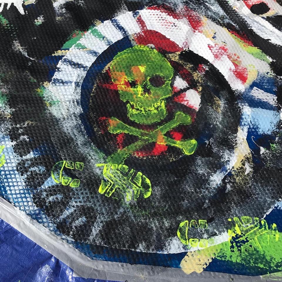 Fluorescent yellow footprints were added by walking across the ‘canvas’ in yellow boots, replenished at each step with yellow paint, and paint ‘bombs’ were dropped from a ladder in black and red. Stencils included fish skeletons and toxic hazard symbols, pound and dollar signs, and the word DESTRUCTION.