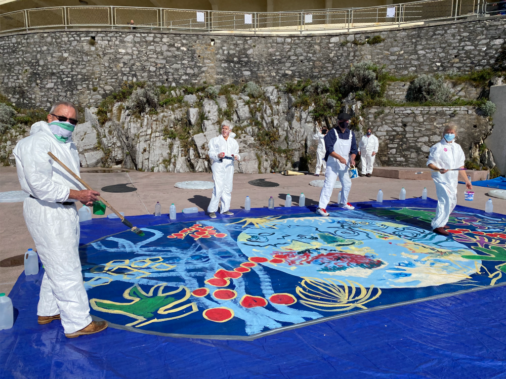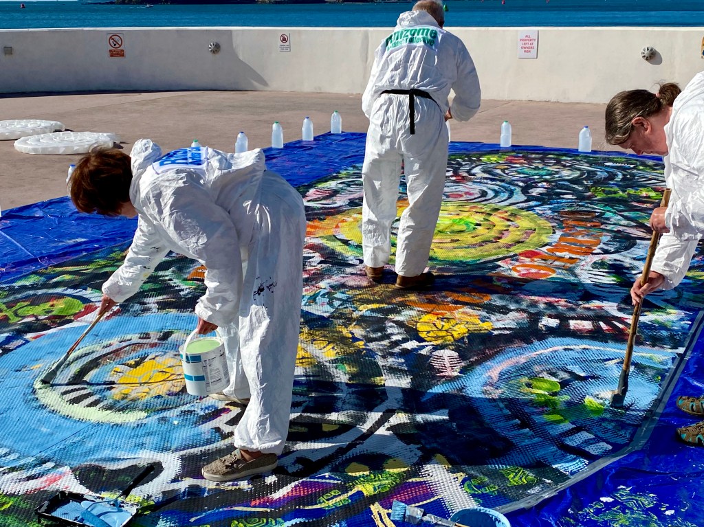 All At Sea was an evolving art performance, coordinated by myself, and created through collaboration with 10 other artists of Rhizome Artists’ Collective, for Plymouth Art Weekender 2020. Located on a terrace at the iconic, art deco Tinside Lido, with the backdrop of the beautiful Plymouth Sound, it was a perfect setting for this work exploring our relationship with the environment and the current ecological and climate crisis. Viewers looked down on the dramatic work from the terraces and promenades above. The sun shone throughout the 3 days, encouraging visitors to the numerous venues and Plymouth Hoe.