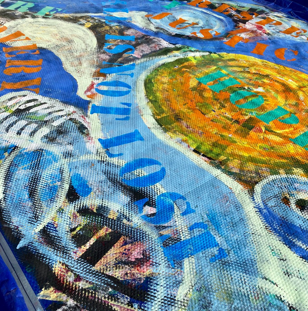 This project was a risk as many of the multitude of ideas were fluid, essentially concepts, the scale was huge, and no-one was ‘in charge’ orchestrating the work. Through online Zoom meetings (at a time of COVID restrictions) we had discussed broad themes and imagery, and organised venues and materials. We ‘practiced’ collaboration by exchanging collages which could be deconstructed and reappropriated to reflect our personal practice. This gave us ‘permission’ to paint over each other’s work, to destroy it, no matter how beautiful it appeared. These collaborations also enabled us to get to know each other better, to understand each other’s thinking and talents.
