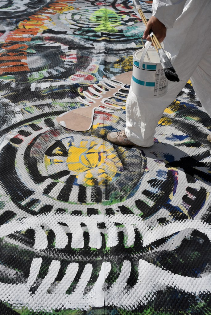 The main focus of the 3 days was a live drawing performance on a re-purposed swimming pool cover, measuring 7 x 3.5m, on the concrete ground, utilising largely salvaged, non-toxic, water-based paints. The performance ‘canvas’ was attached to an even larger blue tarpaulin, all weighed down with sea-water filled, plastic milk containers. Ghostly ammonites, fossils of the Anthropocene, made from over 800 plastic milk containers, were scattered around the arena, together with shadowy black plastic fish forms and streamers of plastic packaging.