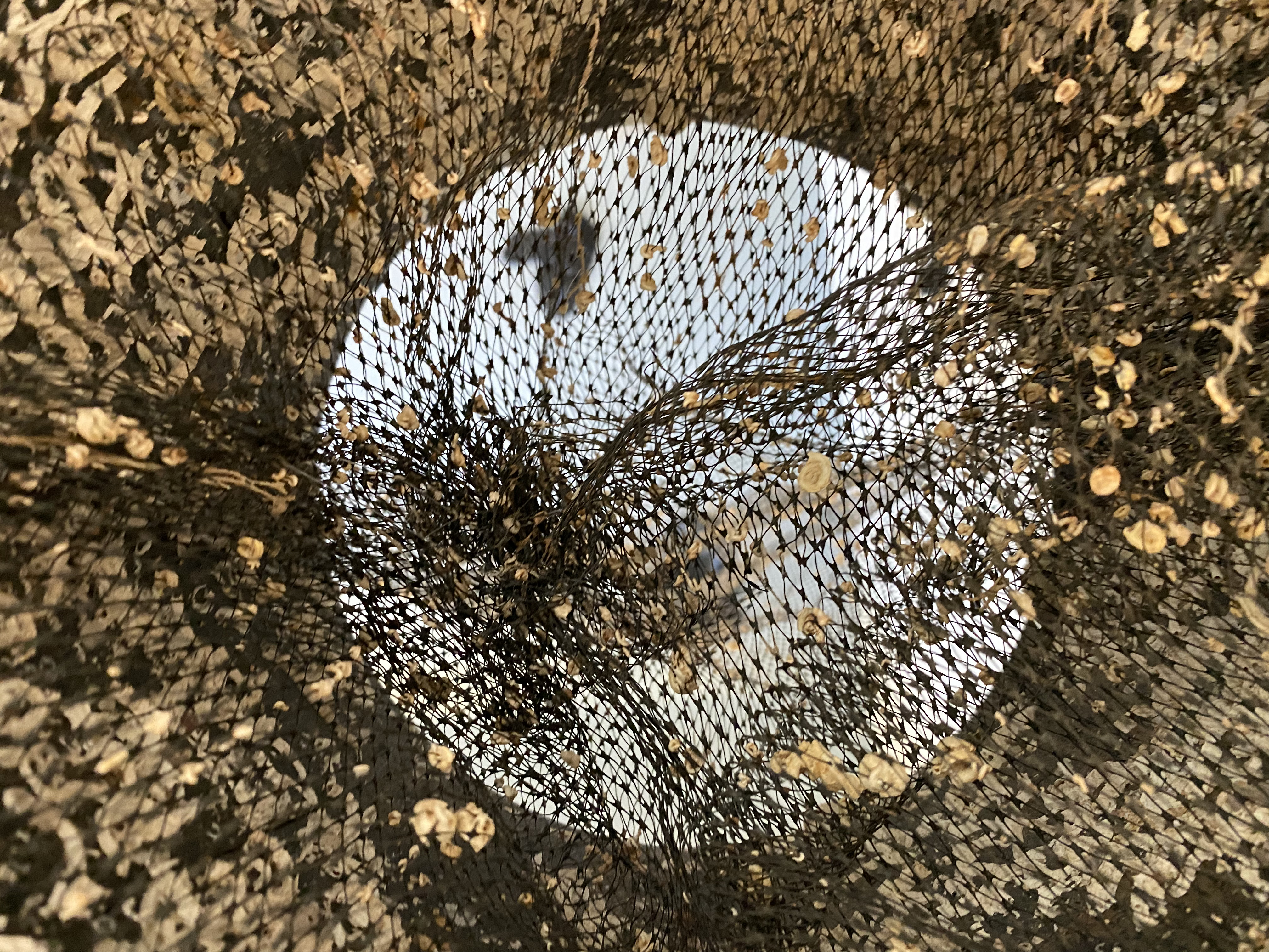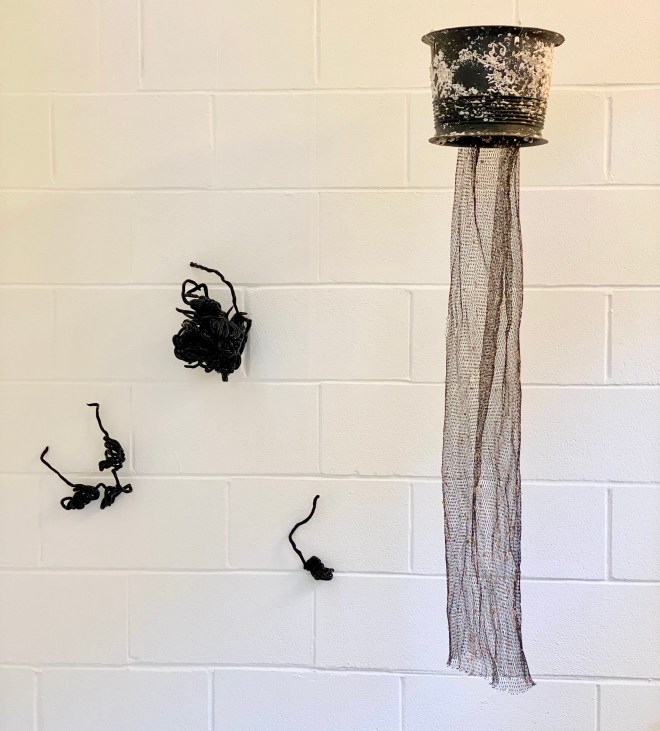 I also had the space for an installation ‘Wrapped’ in a corner ‘pool’ in this old Jaeger factory, showing plastic bottles alongside black plastic forms, nets and this beach-scavenged lobster pot entrance. The organic forms of the twisted black plastic remind us of the uncanny nature of this material which pollutes so much of our precious world.