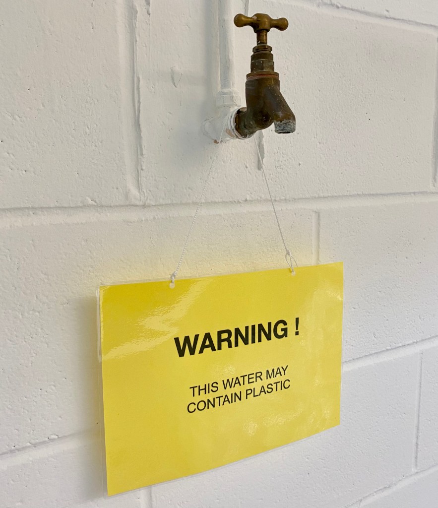 The warning sign on the tap above the ‘pool’ containing the plastic bottles reminds us that so much of the water we drink, the food we eat and the air that we breathe now contain plastic particles.