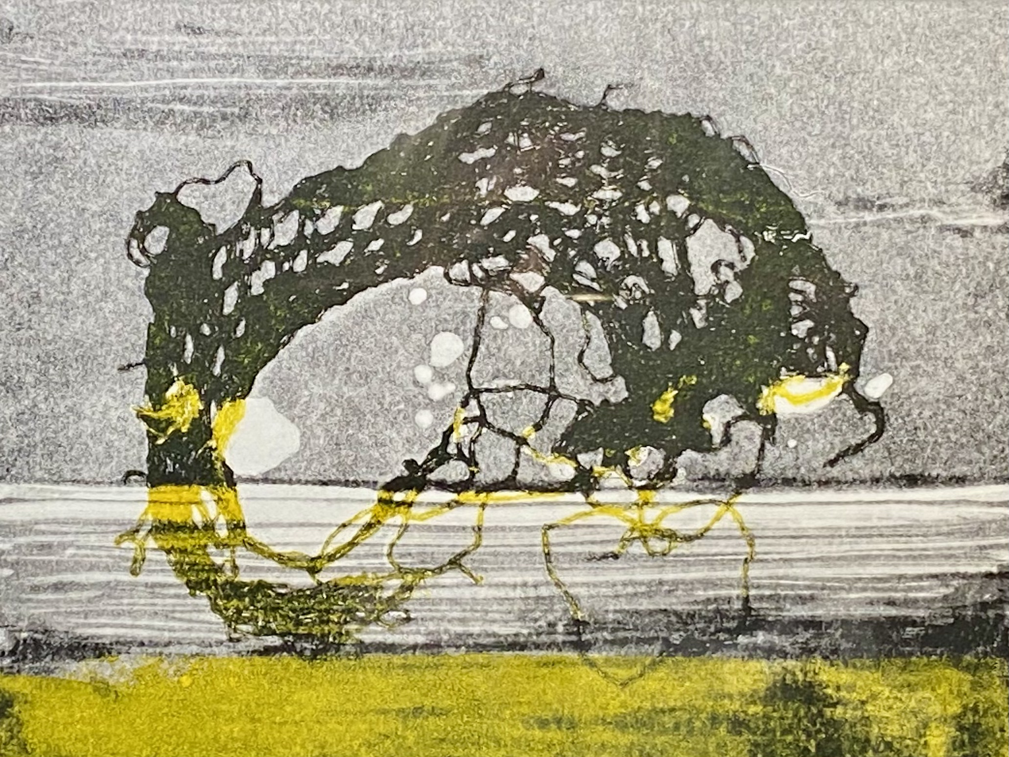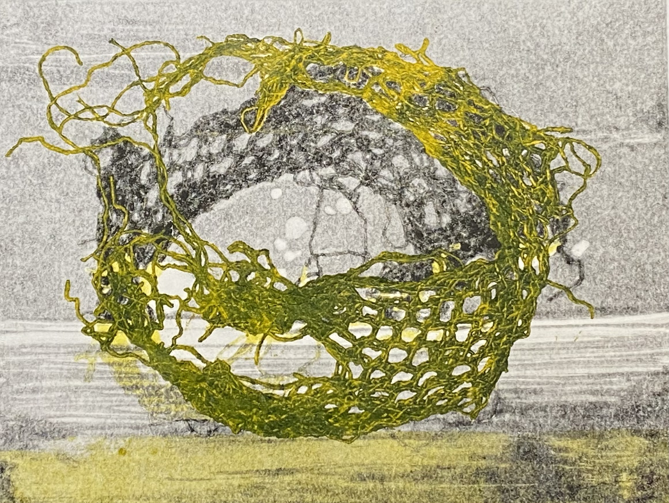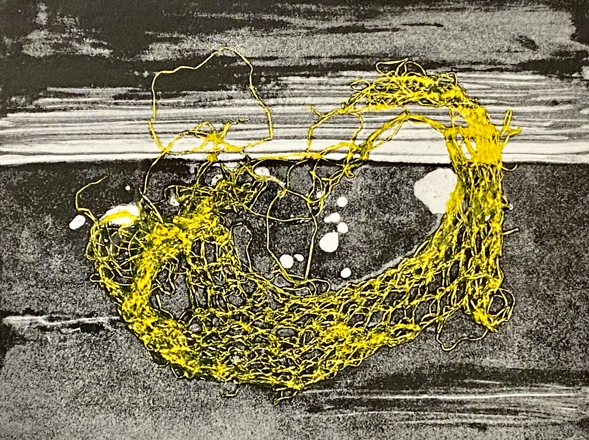 These monoprints are part of a series about plastic in the oceans and the tangled web we leave behind: we are enmeshed by green-wash. Yellow symbolises nature’s warning!