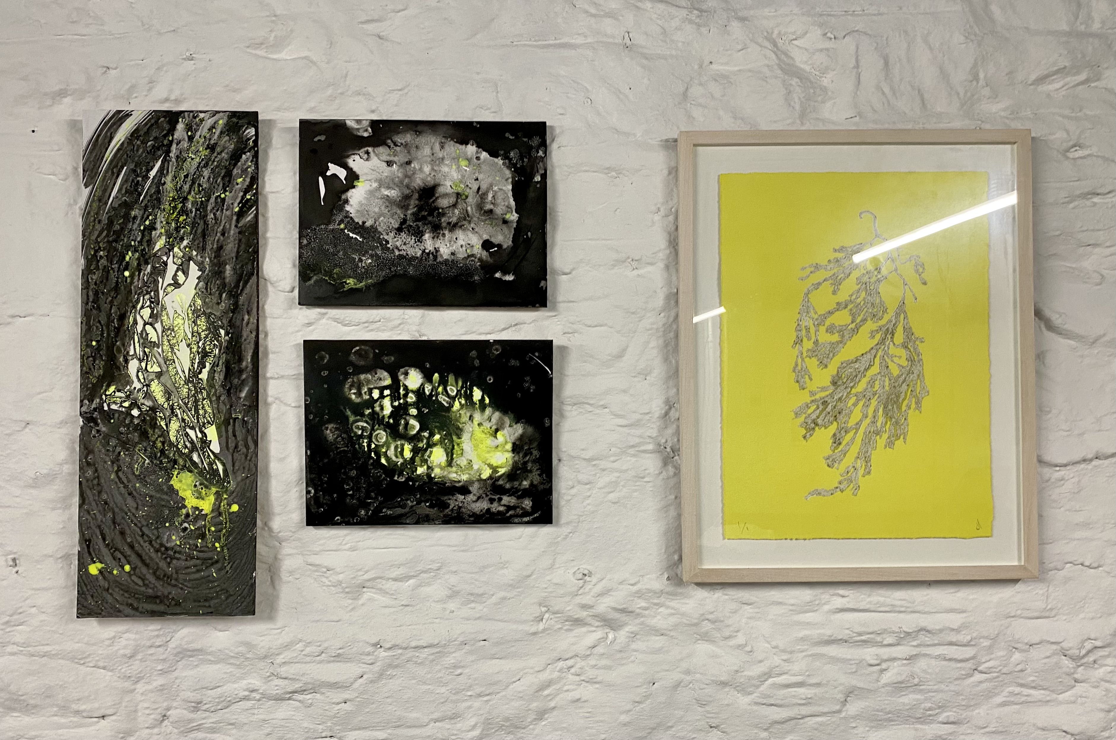 Yellow features again in the backdrop to a seaweed print utilising rocks from the beach to create the pigment for this unique art work. The dark paintings feature imagined sea creatures fluorescing in the depths of the ocean. The paint glows in UV light.