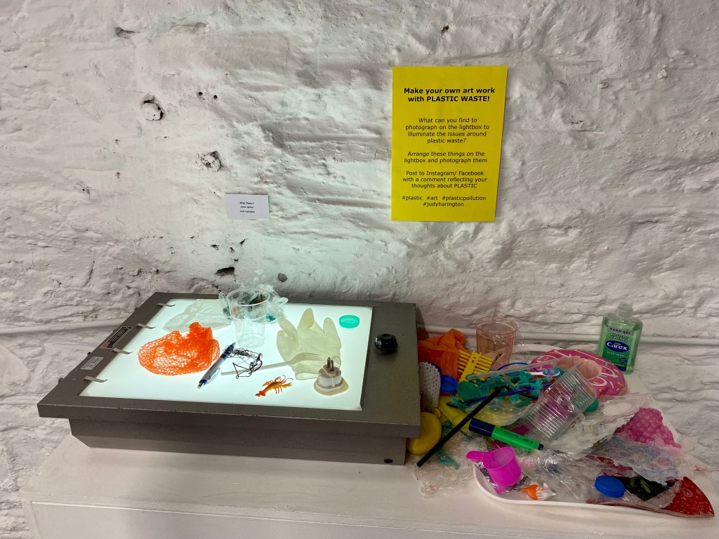 An interactive exhibit always attracts children and young people. I selected clean plastic items to arrange on a lightbox to question our relationship with plastic. Even the sanitiser is container in plastic …