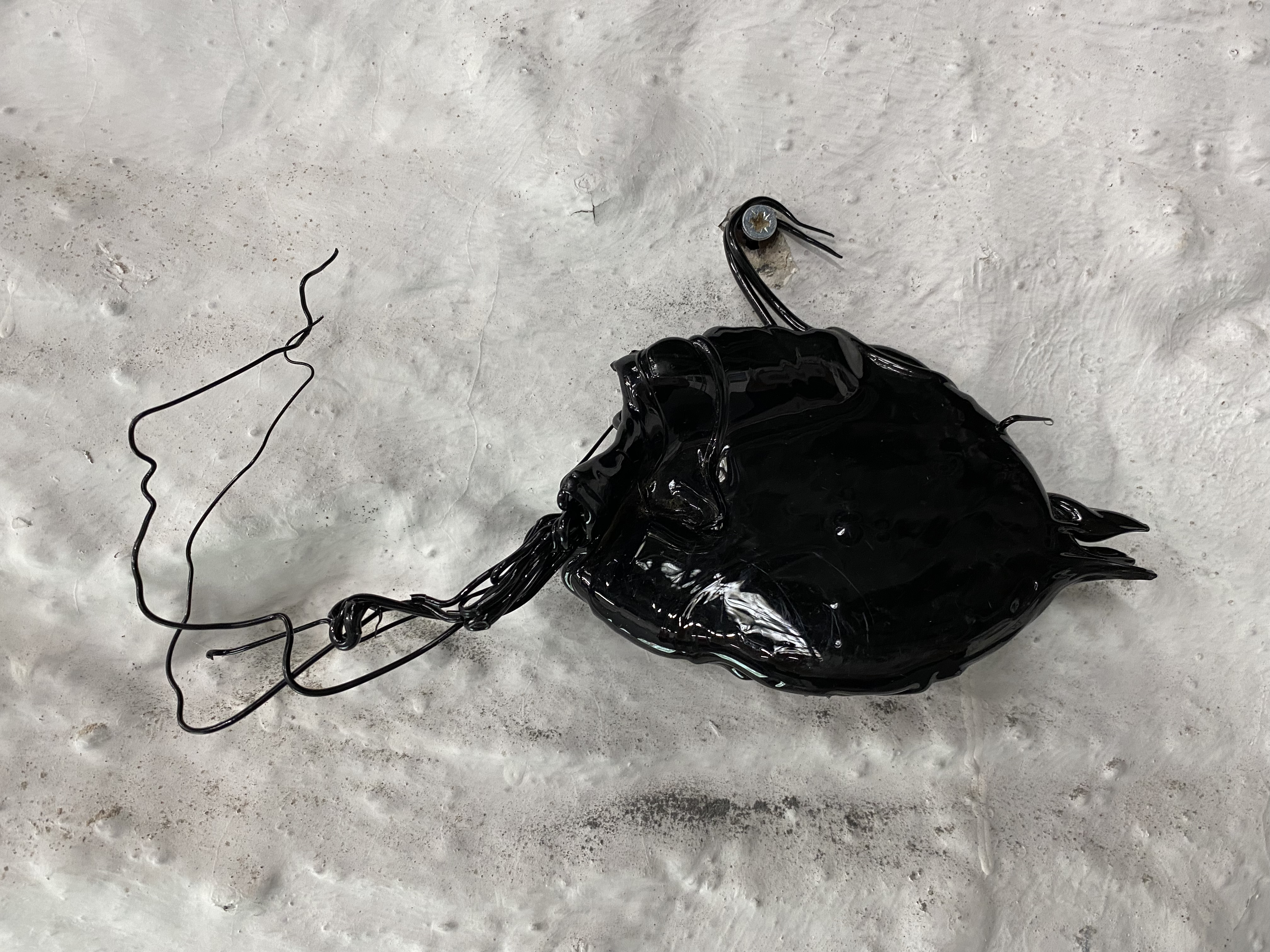 Seaweeds and an extraordinary congealed mass of burnt plastic found on the beach, each shown in an antique wooden frame, contrast the natural and man-made, the things that nurture us and the things that threaten our existence. Beneath and scattered around the exhibits are uncanny lumps of black extruded plastic.