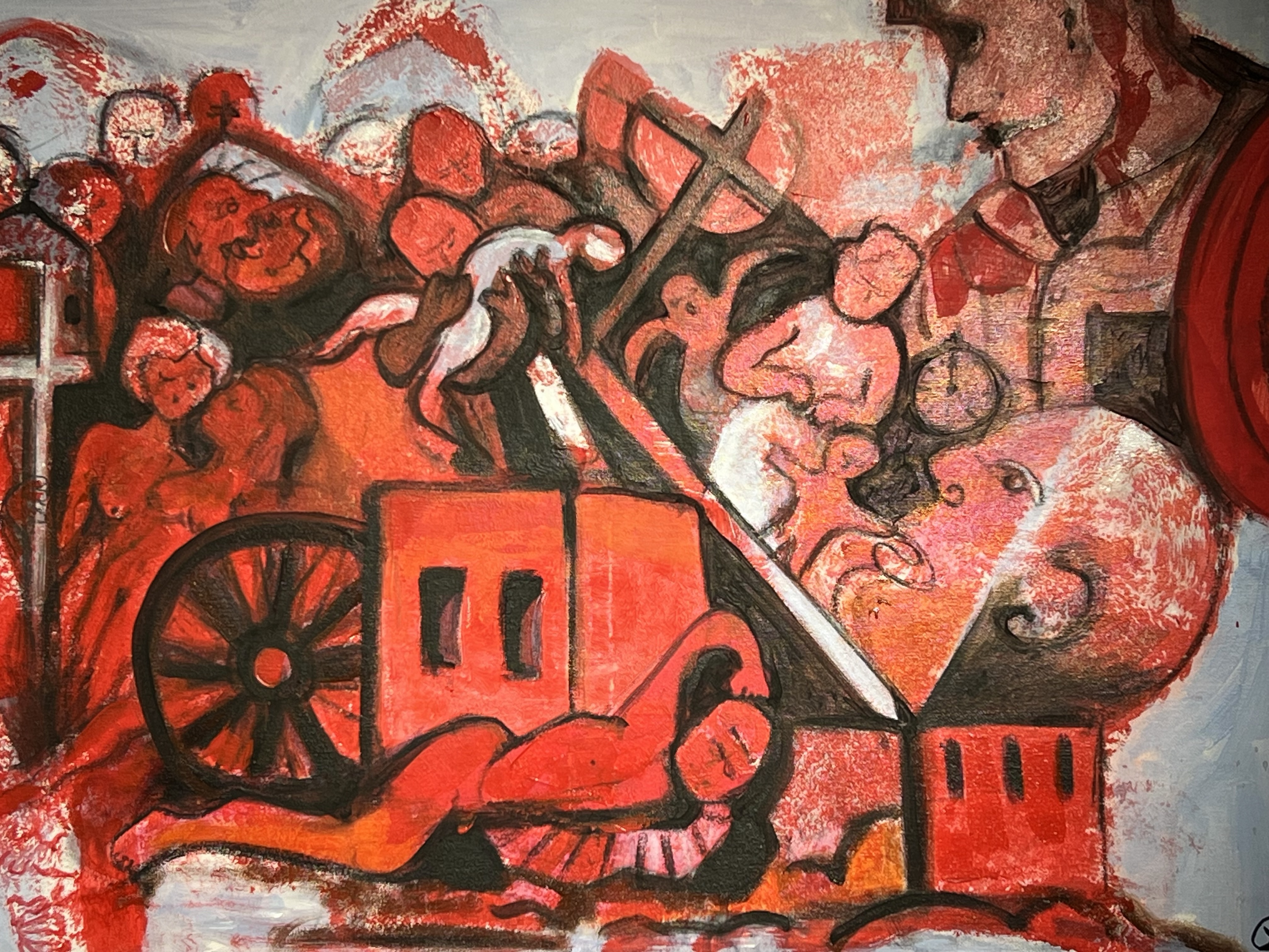 The very talented Jane Athron created a series of powerful oil paintings depicting the horrors of war with reference to Chagall and Picasso.