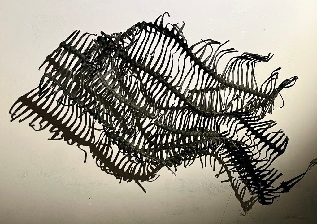 A large charcoal drawing resulted from sketches looking down to the beach from the cliff-top, with that vertiginous, unsettled feeling one gets in such a situation. The world seems spinning out of control… This is juxtaposed with a bodily tangle of black plastic mesh reminiscent of skeletons.