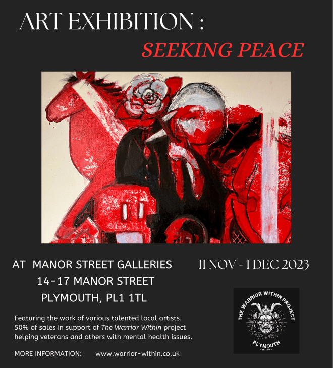 50% of proceeds from sales of art work will go directly to The Warrior Within project to support veterans and others with mental health issues through counselling, music, poetry, martial arts and Yoga. See https://warriorwithin.uk